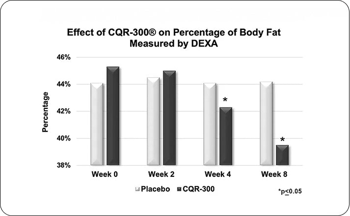 A randomized, double-blind, placebo-controlled pilot trial involving 67 subjects aged 25-60 years old, was conducted over 8 weeks to confirm the efficacy of CQR-300 in reducing body fat.